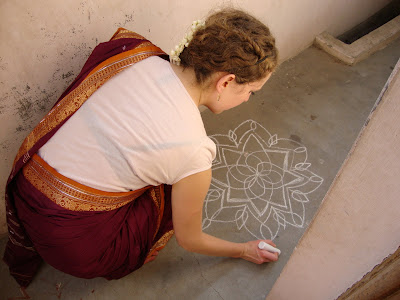 Fuer das Fest kaufen Sie neue Kleider und Feuerwerke. Vor dem Eingang malen sie ein Rangoli-Motiv um die Hausbesucher willkommen zu heissen.