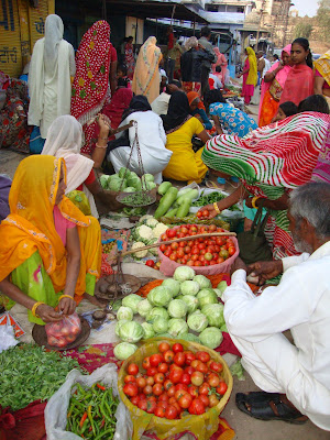 Heute morgen fuhren wir Richtung Pakistan durch eine karge Landschaft nach Jaisalmer und morgen reisen wir auf Kamelen durch die Wueste...