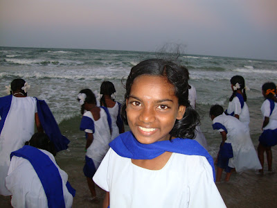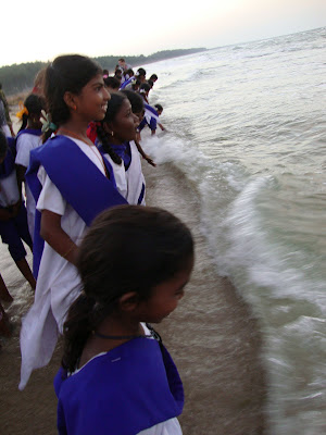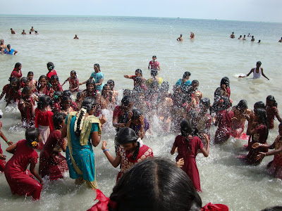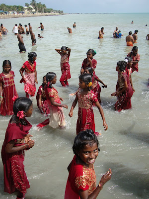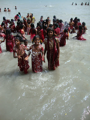 Nach dem Essen fuhren wir zum Strand wo die Mädchen und die Lehrerinnen ein Bad im Meer nahmen. Das Ufer und das Wasser war nicht gerade sauber, aber es war ein heiliger Ort und deshalb baden alle dort. Die meisten Mädchen sahen das Meer zum ersten Mal und freuten sich riesig. Es wurde gespritzt, geplantscht, gelacht und gestaunt und es lag so viel Freude und Glück in der Luft, dass sogar Oswald Grübel gelacht hätte.
